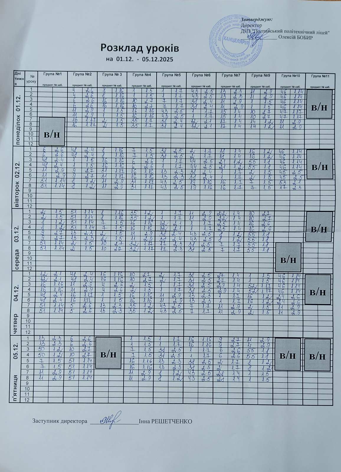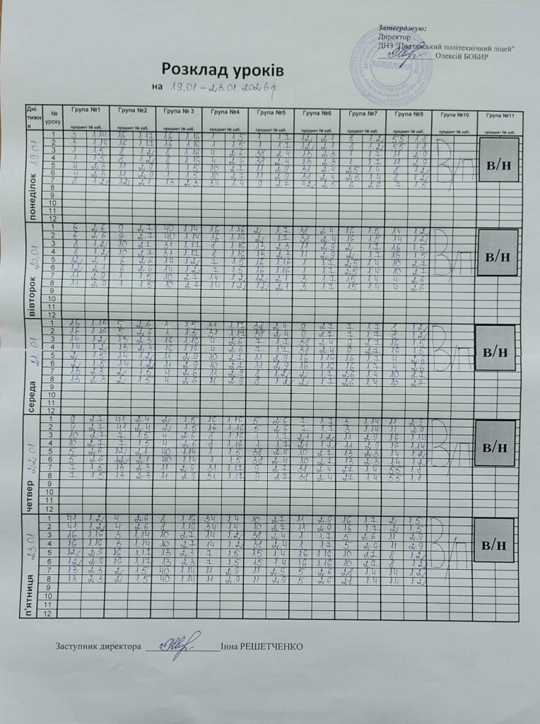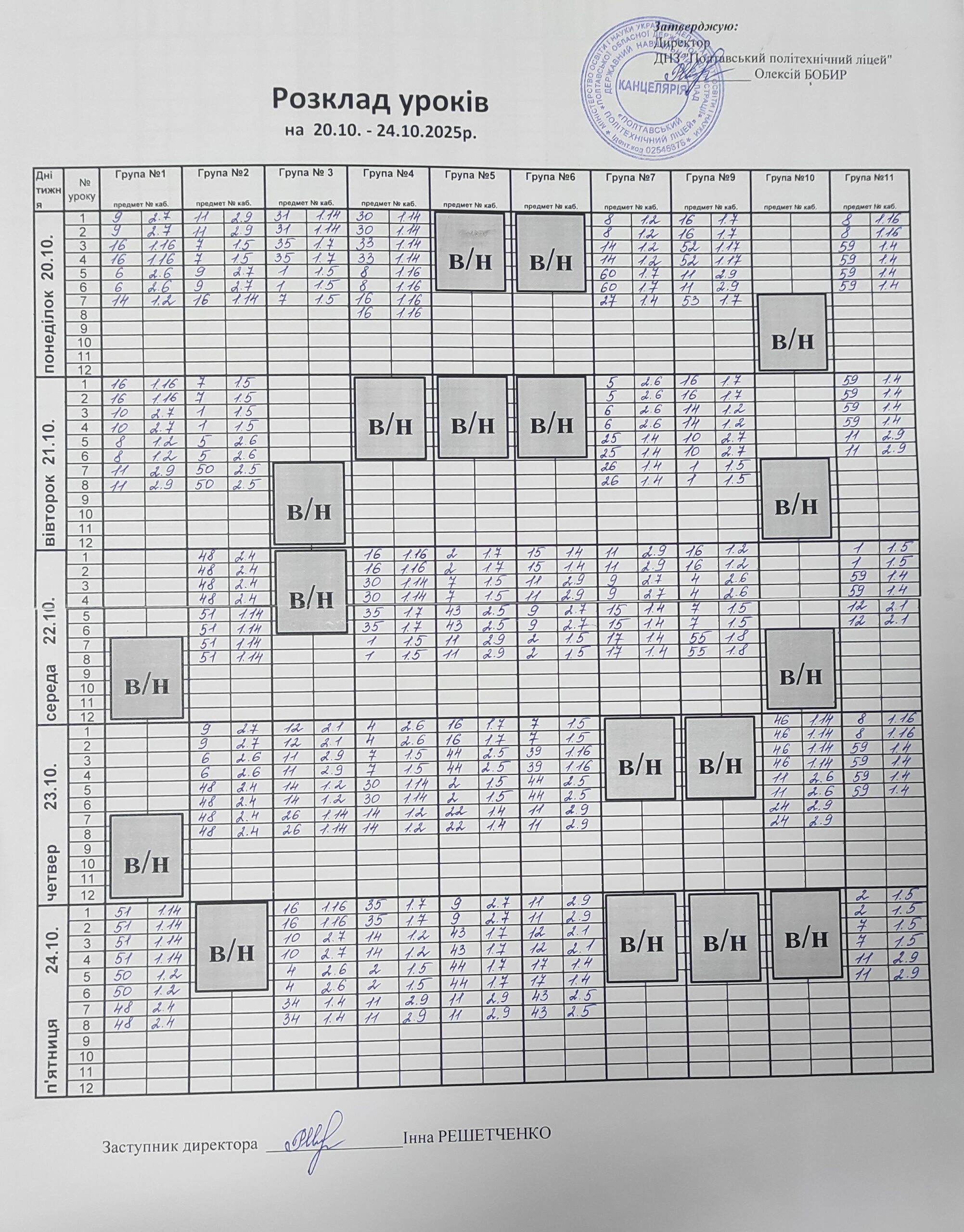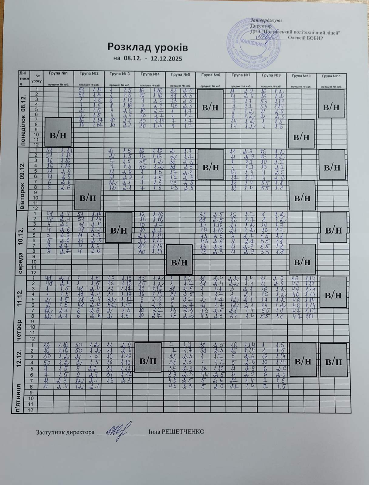 На нашому ліцейному сайті https://politech.pl.ua ви самостійно зможете знайти розклад. Він знаходиться у Головному меню ->Учню -> Розклад занять (в цій схемі ми свідомо робимо неактивні посилання, для того, щоб ви самостійно розібралися де шукати)