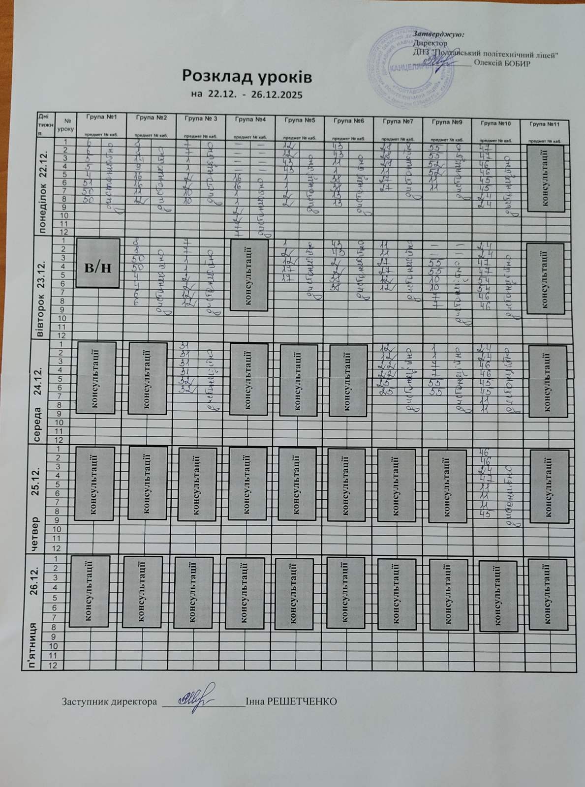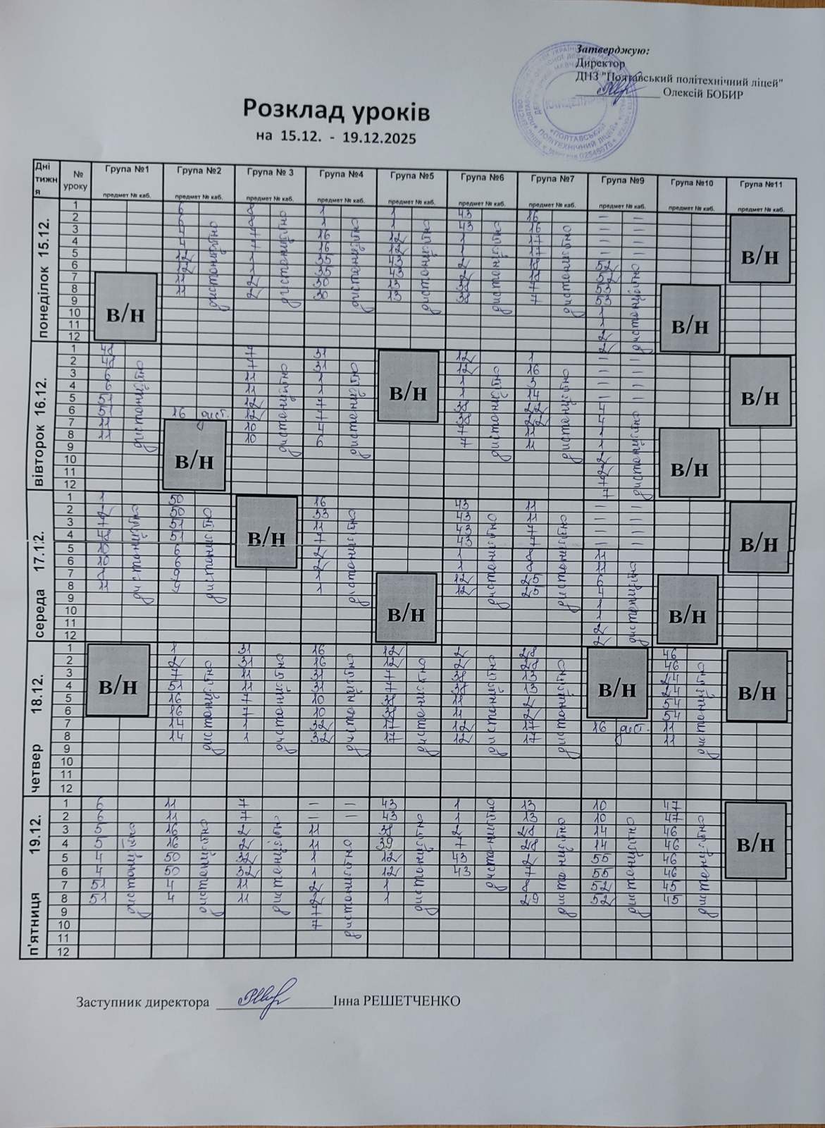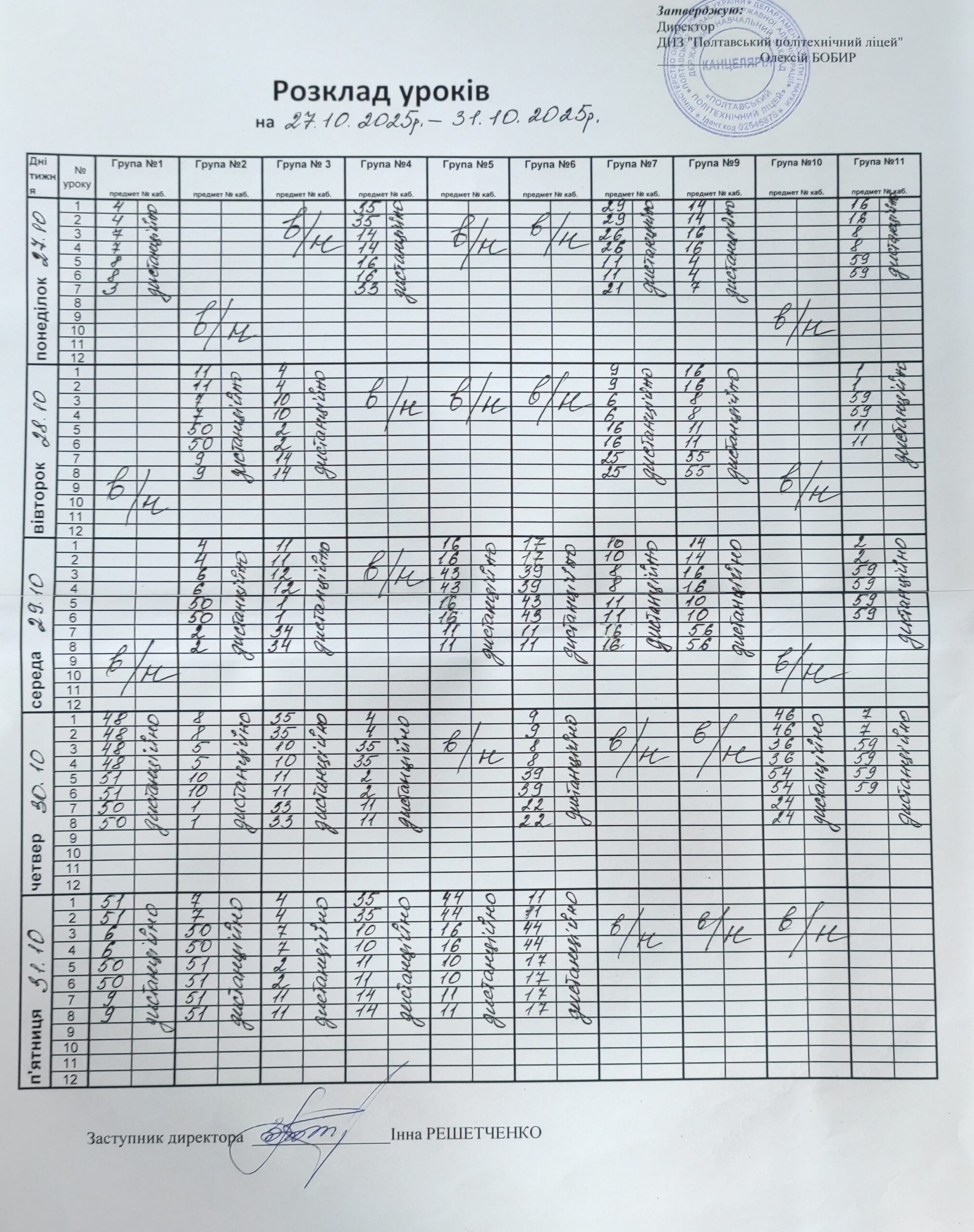На нашому ліцейному сайті https://politech.pl.ua ви самостійно зможете знайти розклад. Він знаходиться у Головному меню ->Учню -> Розклад занять (в цій схемі ми свідомо робимо неактивні посилання, для того, щоб ви самостійно розібралися де шукати)