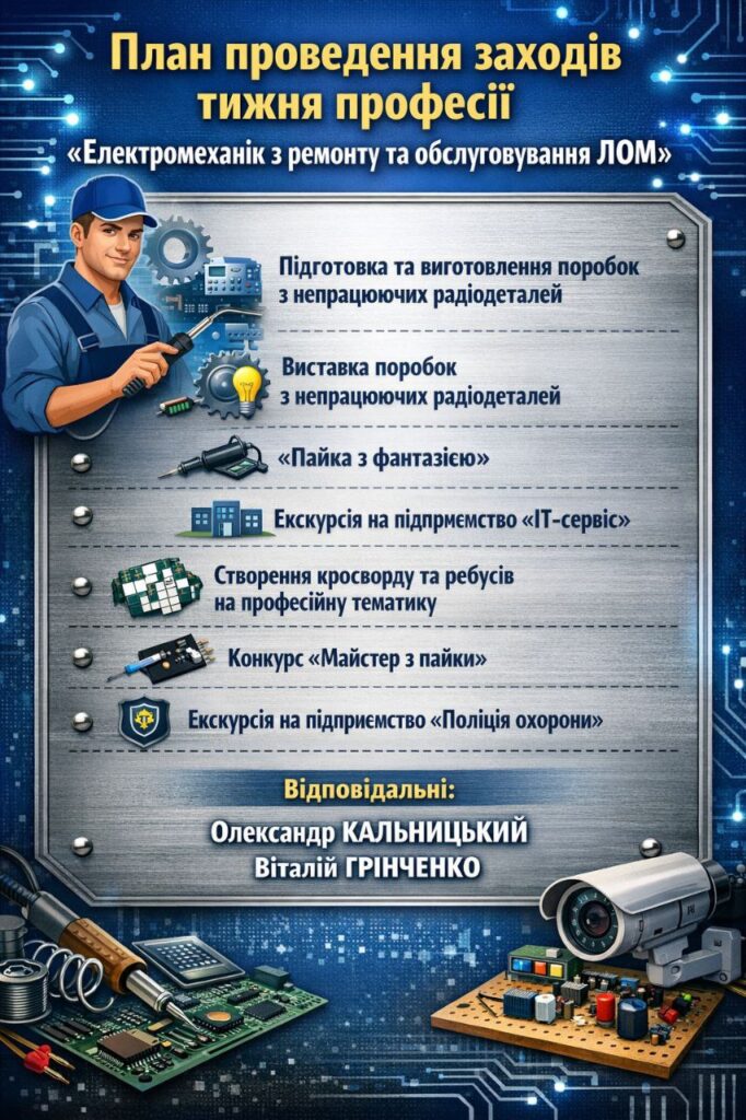 У нашому закладі освіти стартує тиждень професії «Електромеханік з ремонту та обслуговування лічильно-обчислювальних машин» — подія, спрямована на популяризацію технічних спеціальностей, розвиток професійних компетентностей студентів та підвищення інтересу до обраної професії.